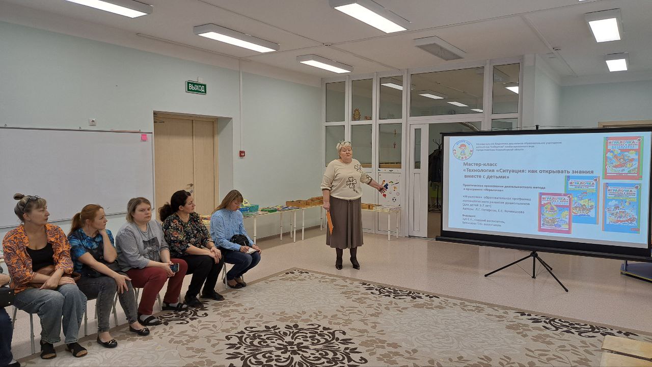 30 октября 2025 года в МБДОУ «Сибирячок» состоялся мастер-класс «Технология "Ситуация": как открывать знания вместе с детьми», организованный в рамках работы «Школы профессионального роста» для педагогов дошкольных образовательных учреждений города Искитима. Мероприятие посвящено практике применения деятельностного метода Л.Г. Петерсон и Е.Е. Кочемасовой в программе «Игралочка», которую реализует детский сад «Сибирячок» во всех возрастных группах. Особенностью программы является ее ключевая идея - не передача готовых знаний, а создание условий для самостоятельного открытия их детьми. Именно этот подход продемонстрирован на мастер-классе. Старший воспитатель Зуб Елена Николаевна представила теоретические основы технологии, раскрыв методику создания проблемных ситуаций, которые побуждают детей к самостоятельному познанию.